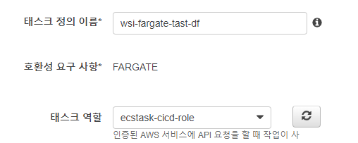 3. 작업 정의 이름을 입력한 후 테스크 역할을 선택합니다. 테스크 역할에 부여한 정책은 다음과 같습니다.