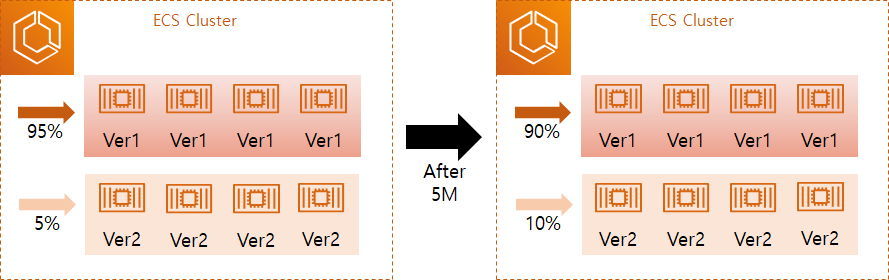 - CodeDeployDefault.ECSAllAtOne: 모든 트래픽을 업데이트된 Amazon ECS 컨테이너로 한 번에 이동합니다.