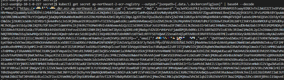 - 토큰 값만 출력 - kubectl get secret ap-northeast-2-ecr-registry --output="jsonpath={.data.\.dockerconfigjson}" | base64 --decode